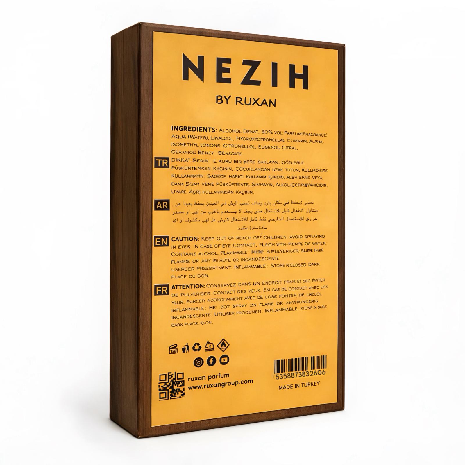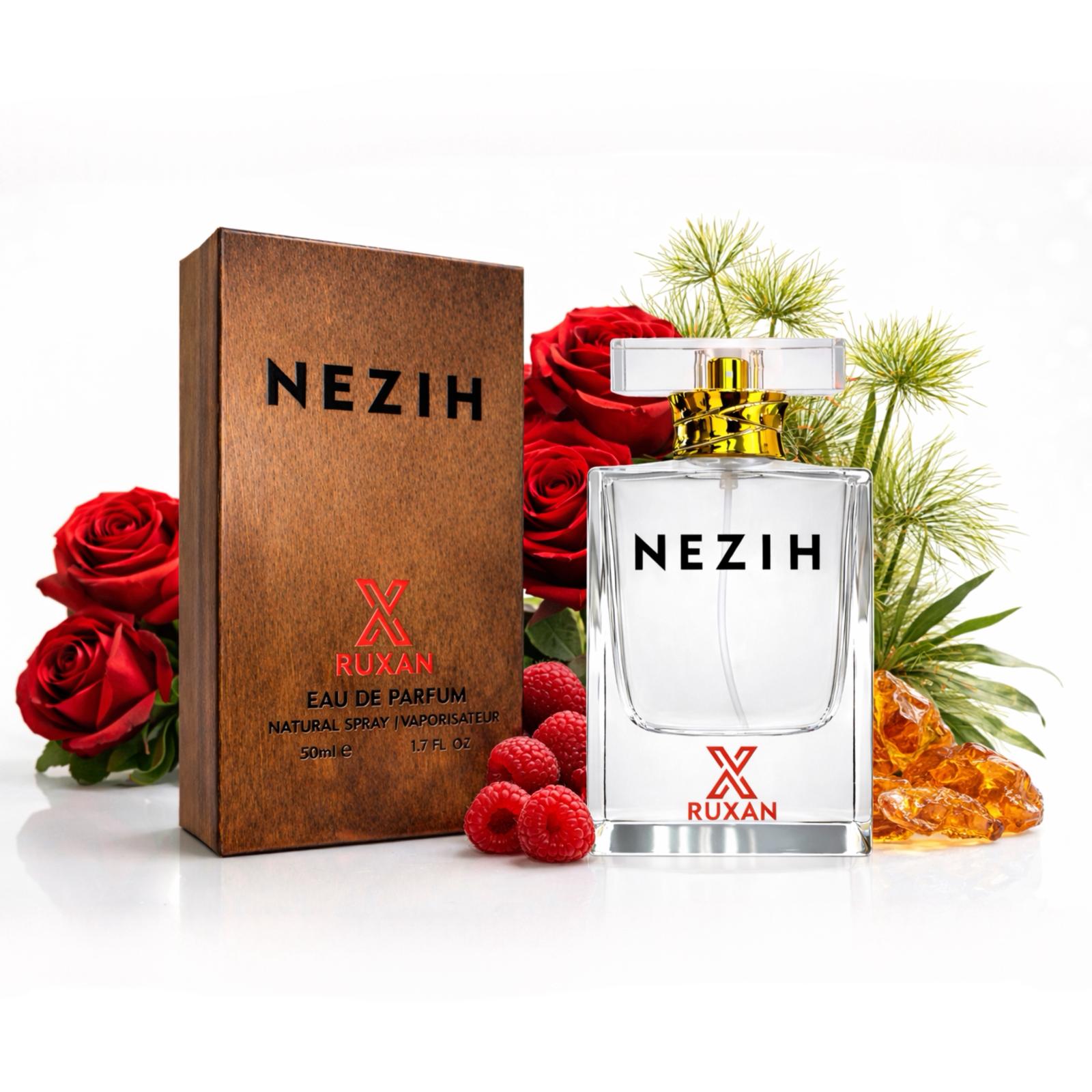 Nezih, Ruxan Perfumes tarafından sunulan, kadınlar ve erkekler için tasarlanmış etkileyici bir oryantal baharatlı parfümdür. Zarif gül notalarının sıcak ve sofistike dokunuşlarla birleştiği bu özel koku, modern parfüm severler için unutulmaz bir deneyim sunar.